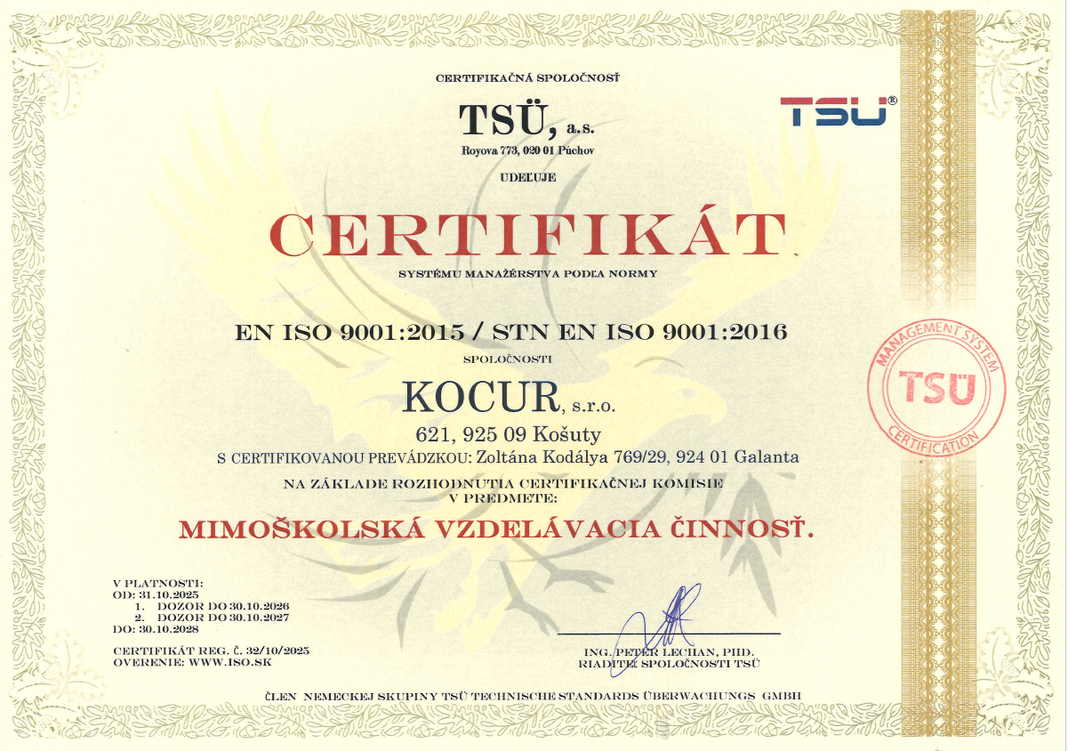 Naša spoločnosť je držiteľom certifikátu ISO 9001, ktorý potvrdzuje, že kvalita našich služieb a procesov spĺňa medzinárodné štandardy. Podľa systému riadenia kvality ISO 9001 pracujeme preto, aby sme vám dokázali, že vaša spokojnosť a kvalita našich služieb je pre nás prvoradá.